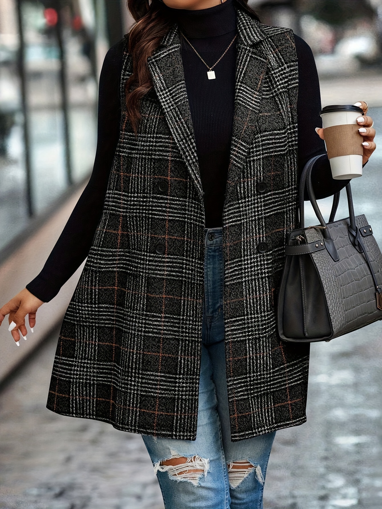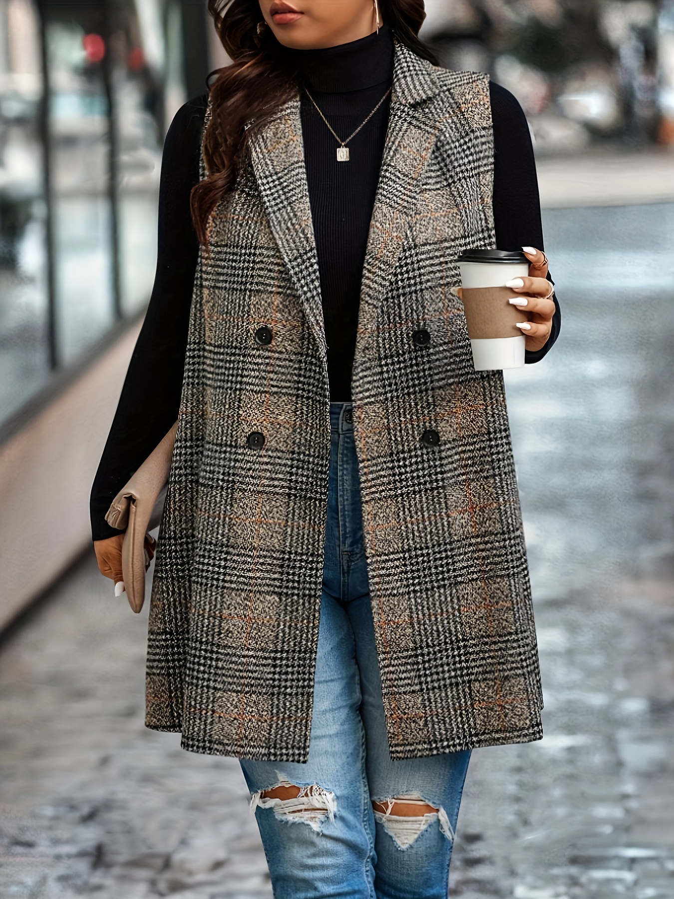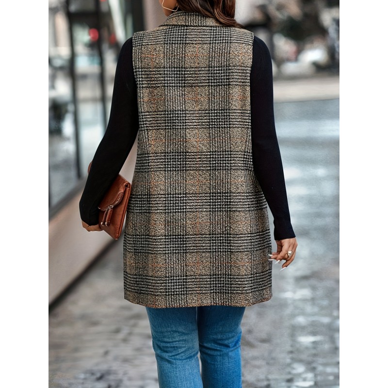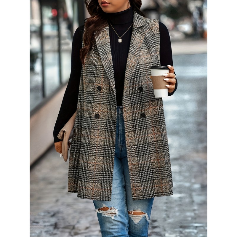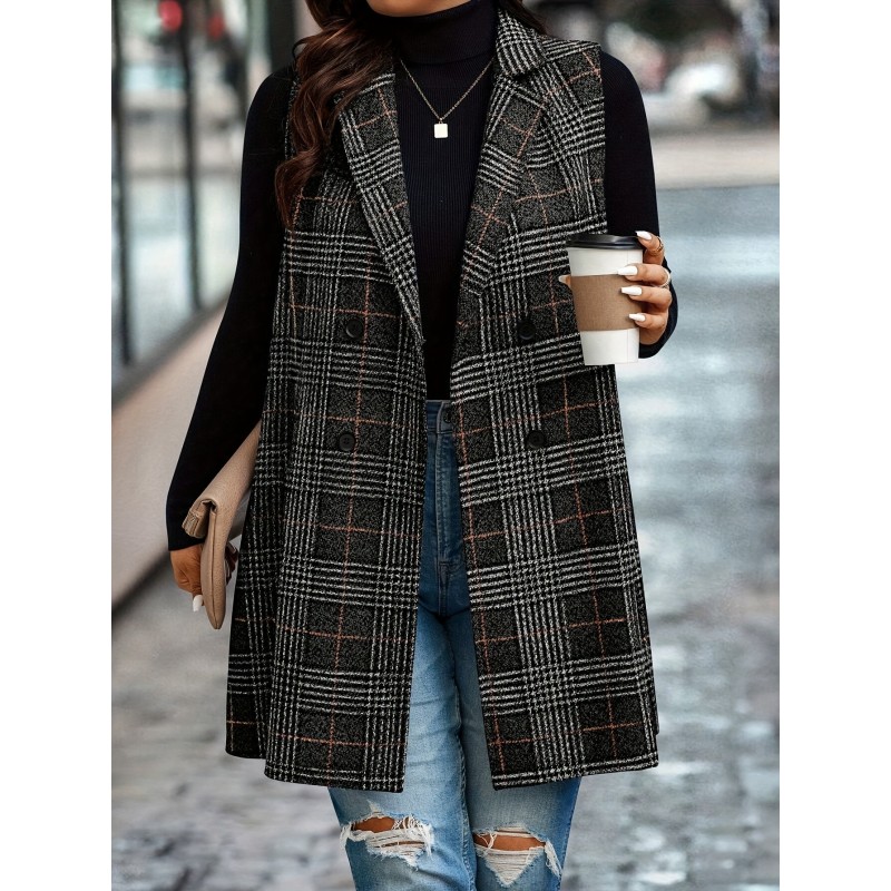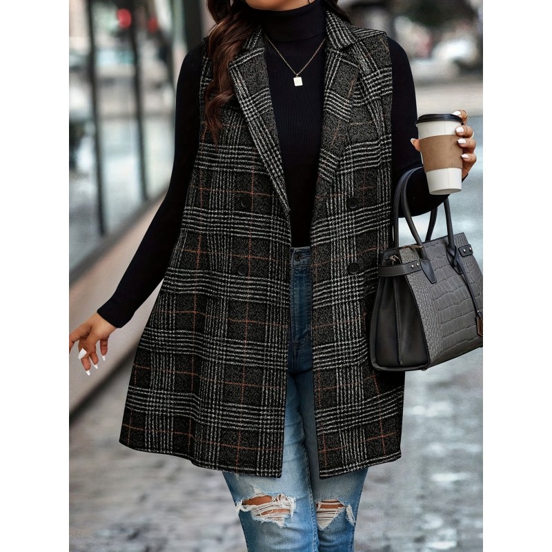 1pc Elegant Plus Size Plaid Double-Breasted Waistcoat - Casual Polyester Midi Vest with Lapel Collar and Woven Fabric