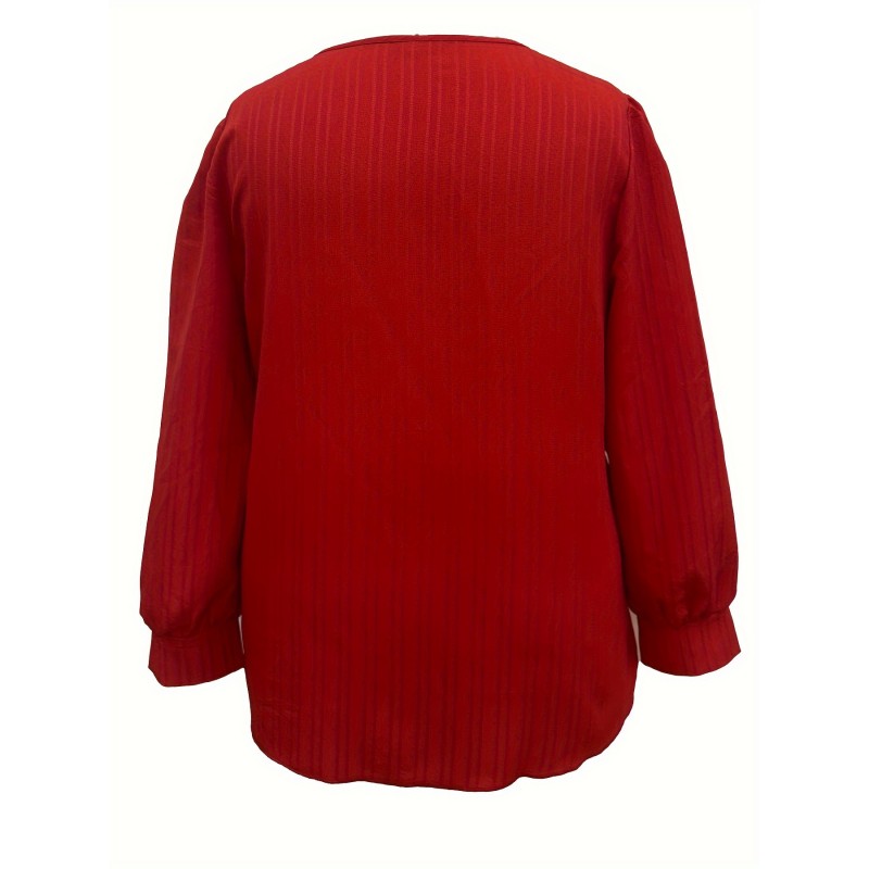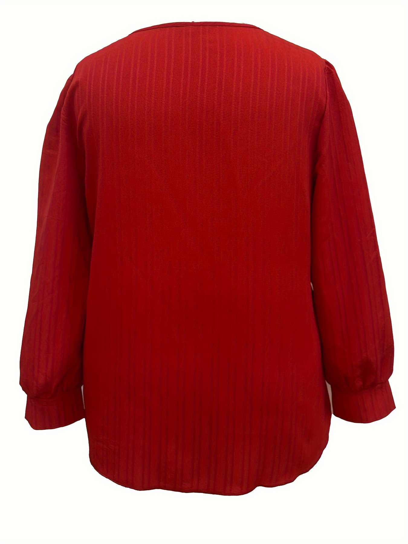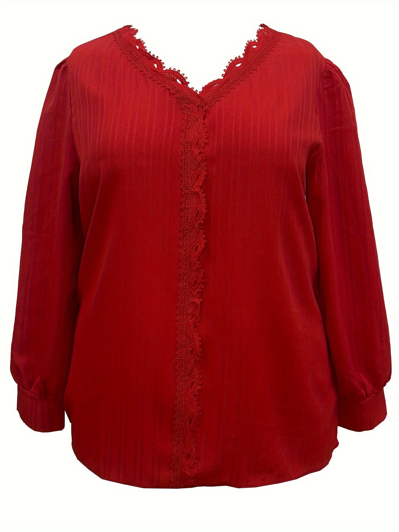 Plus Size Lace Trim Textured Blouse, Elegant V Neck Long Sleeve Top For Spring & Fall, Women's Plus Size Clothing