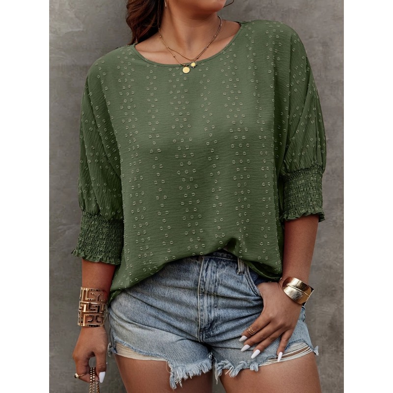 Plus Size Solid Pullover Blouse, Crew Crew Neck Half Sleeve Shirred Cuff Blouse For Spring & Fall, Women's Plus Size Clothing