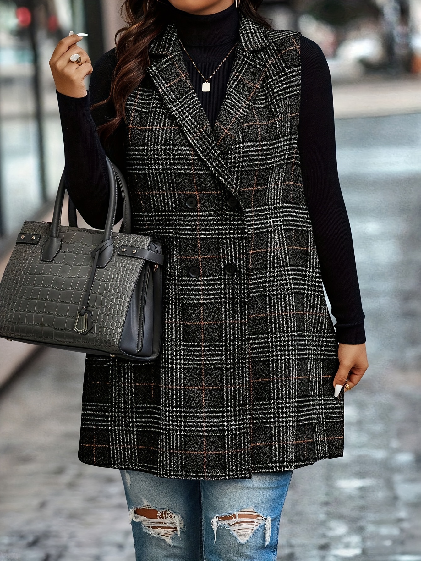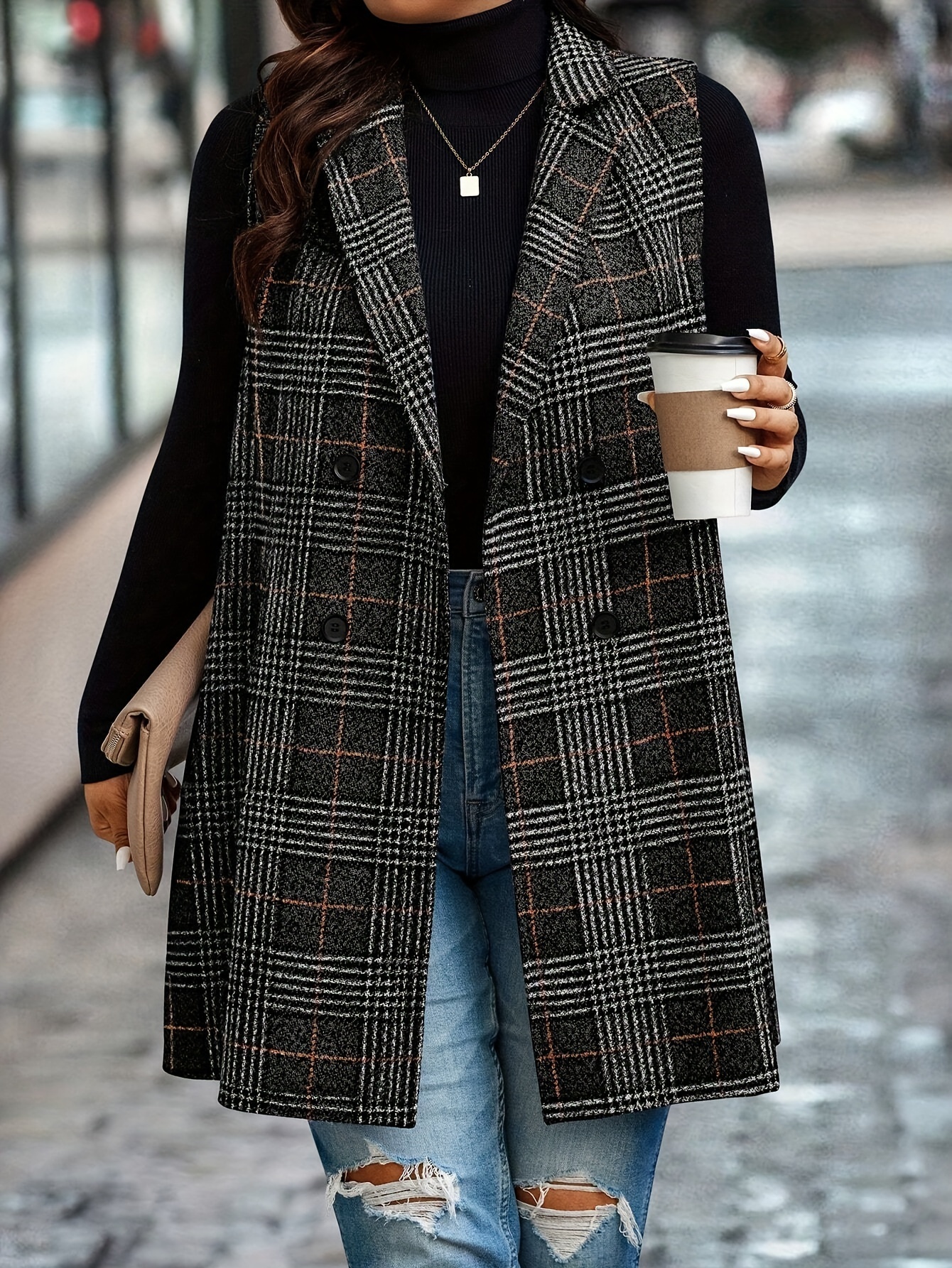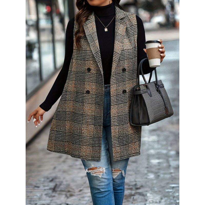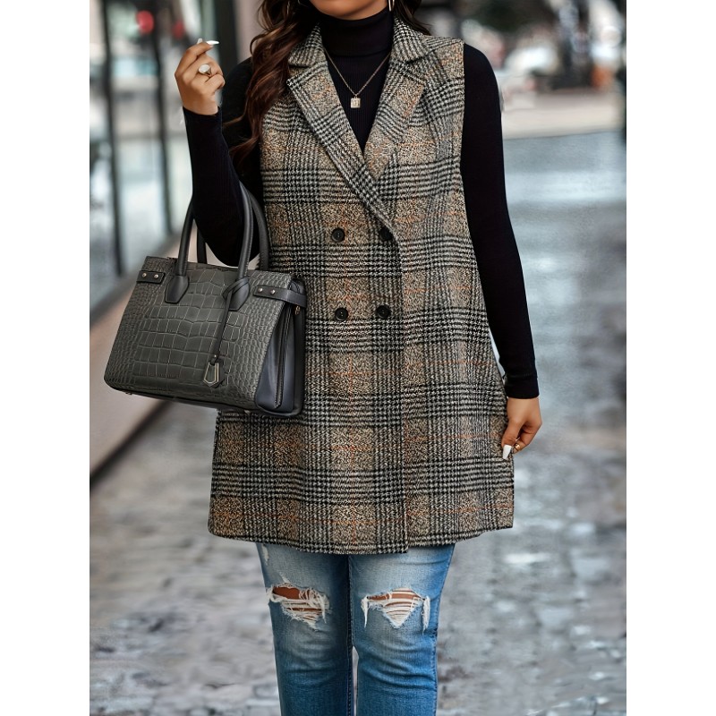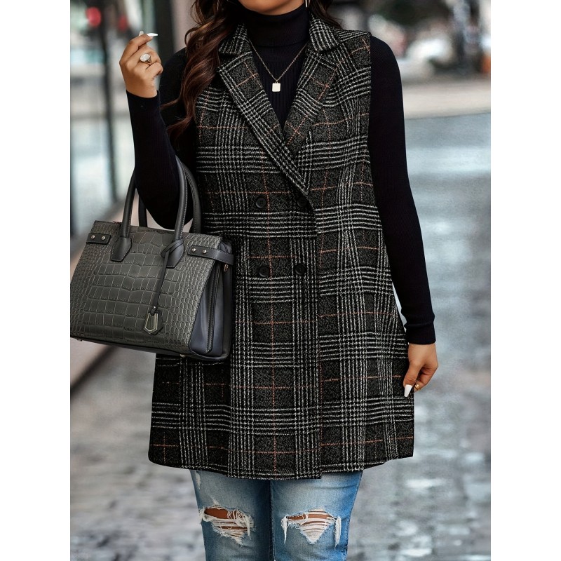 1pc Elegant Plus Size Plaid Double-Breasted Waistcoat - Casual Polyester Midi Vest with Lapel Collar and Woven Fabric