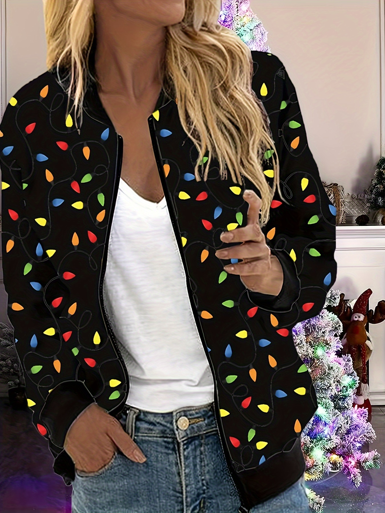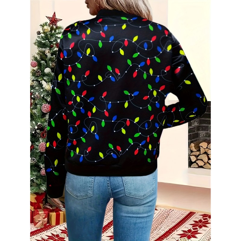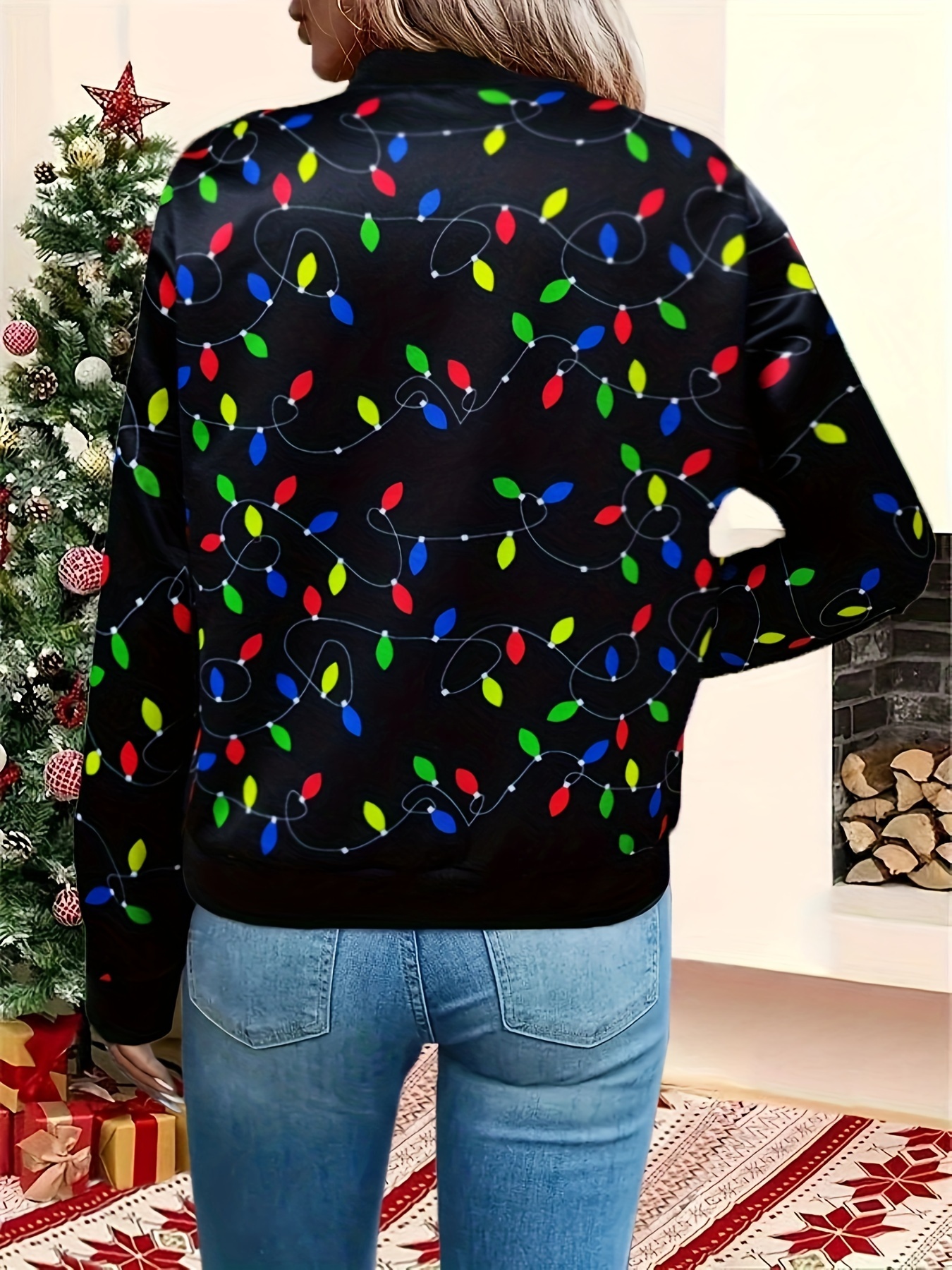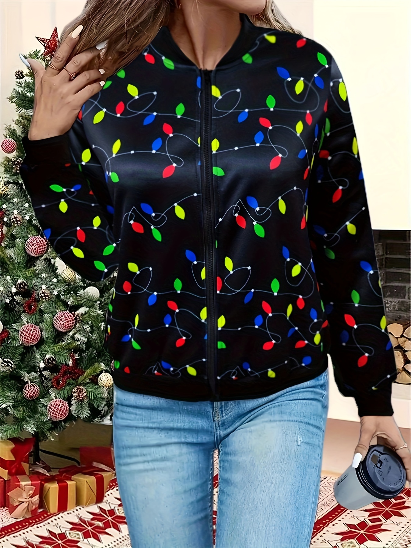 Plus Size Elegant Christmas Light Print Jacket - Polyester Knit Fabric with Elastane, Stand Collar, Medium Stretch, Zipper Detail, Winter Festive Outerwear